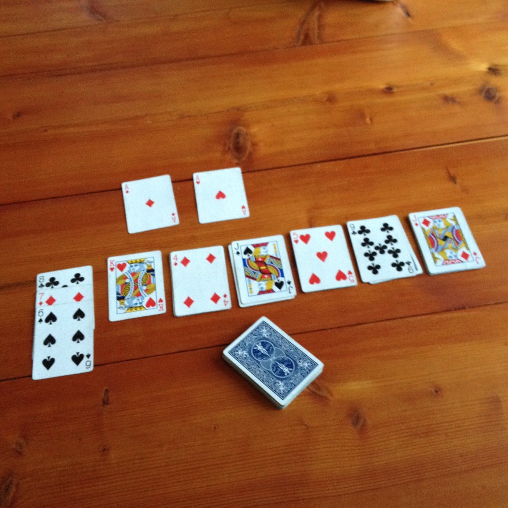 Why should I care if I can stack all my cards up on the aces? What does that prove? Whom have I beaten? Is it my rage against the gods, or the inherent unfairness of the universe? Repressed aggression against all those many people who’ve underestimated me, or never given me a chance? Why should this make me happy? At least with poker, crazy eights, hearts, rummy, or nerts, I have used some skill to win. Instead I’m here taking on the multiverse itself, wrestling with the divine. I could say more, but there is a deck of cards in front of me, and nobody else is awake yet. I do what anyone would do alone in such circumstances.