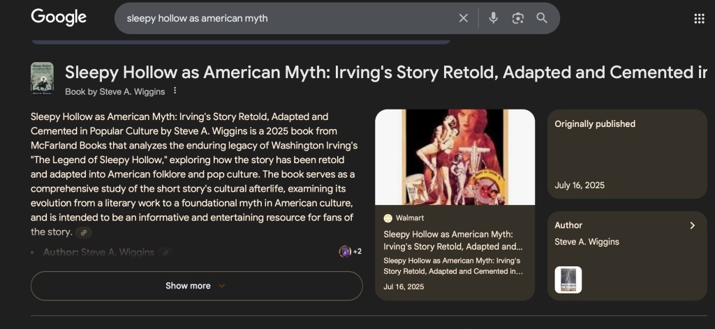 I admit to Googling my own books from time to time. (I know, I know! You’ll go blind if you don’t stop doing that!) Since I haven’t yet seen any royalties (or reviews) yet for Sleepy Hollow as American Myth, I searched for it. Google now has a page topper, generated by AI, I suspect, that goes across specific searches such as for a person who’s got some internet presence, or a book. Not all books get such a banner, however; yes, I’ve looked. My Sleepy Hollow book, however, pulled up a page topper. It was still a work in progress, however. By the way, I did this search with results not personalized; Google knows people like to see themselves topping a page. So here’s what I saw: