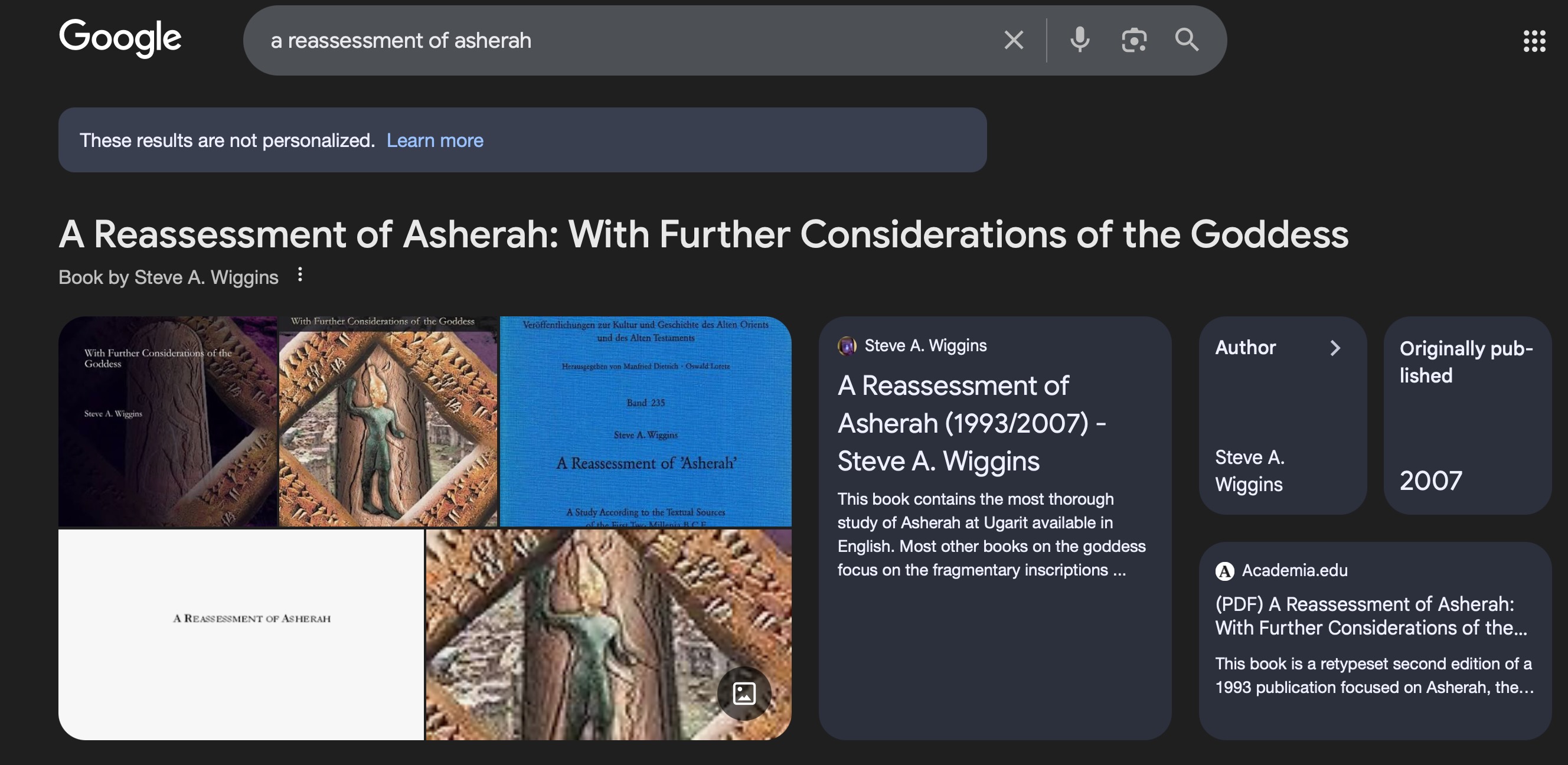 None of my other books get their own banner/topper on Google, except A Reassessment of Asherah. That isn’t my best selling book, but it is my most consulted. That banner, however, also has mistaken information. It says it was originally published in 2007. The original date as actually 1993. Web-scraping may not help with that. The book, as originally published, didn’t have an ebook, and the information about it largely comes from the second edition, published by Gorgias Press. But then, only humans are concerned with such things. There are no sultry women staring out of one of the topper windows, so the images appear to be correct. That’s one of the funny things about being a human author—you want the information about your books to be right. Of course, I should probably cut down on the Googling of my own books. It’s unseemly.