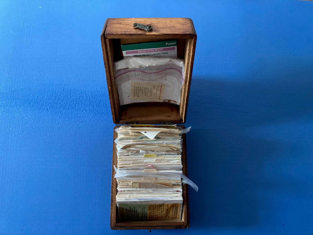 Childhood is strange. We tend to cast a kind of rosy glow on it, even if it wasn’t very pleasant. In my case, Mom was my protector. I grew up without a father present and one of my greatest fears on becoming a father was that I didn’t know how to be one. My role models were television figures and men I’d met and admired in my own life. My father was a stranger but Mom made play dough for us at home when we couldn’t afford to buy it at the store. After my daughter was born, and was old enough for them, the smells of Crayola and Play-Doh took me back to that pleasant version of childhood where things were fine and I had nothing better to do than to play. Mom would prepare part of the many tons of food I would eventually consume. And it all came from a simple wooden recipe box.