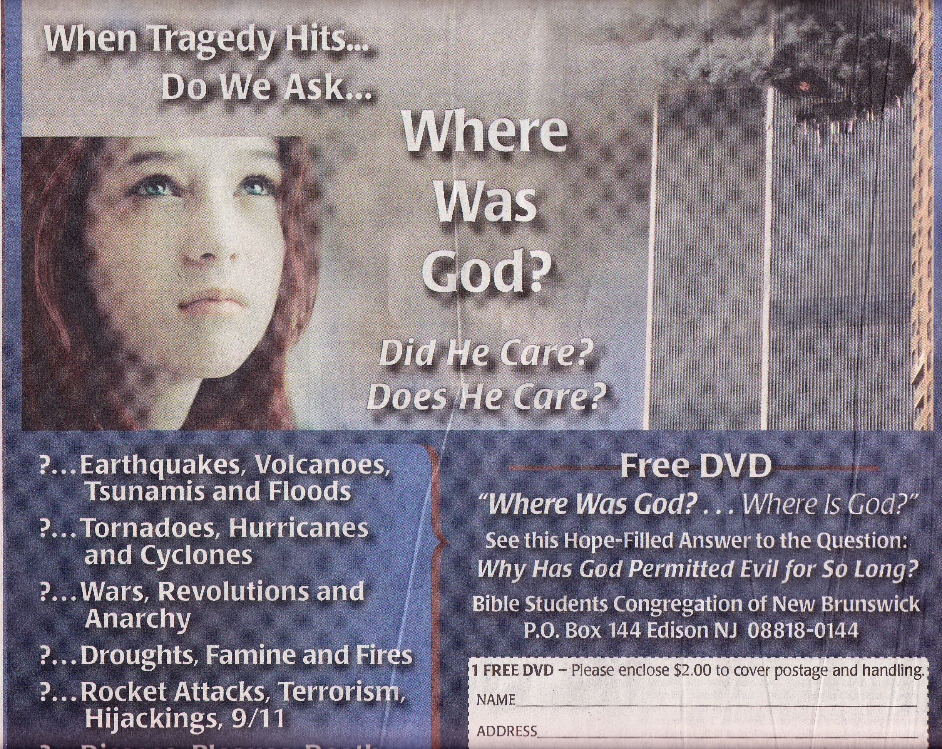 Some preached that God was punishing a sinful nation. In my first sermon after the attack I could not prevent the tears as I asked: when did God change his mind? Did not Jesus ask, “Or those eighteen, upon whom the tower in Siloam fell, and slew them, think ye that they were sinners above all men that dwelt in Jerusalem?” according to Luke 13.4? No, the deity punishing us is our own psyche, our evolution in the primordial stew of self-preservation. Unevolved religion.