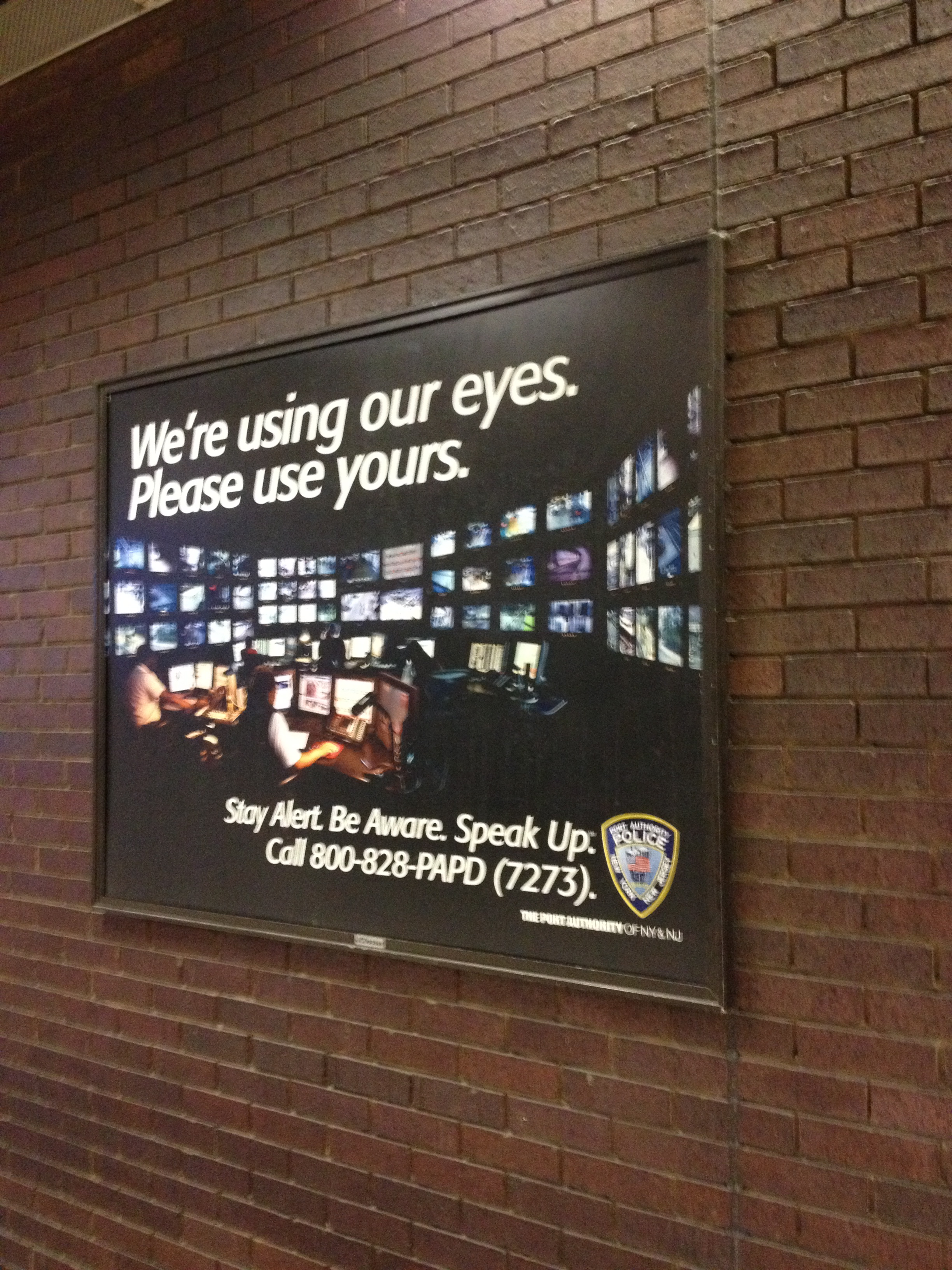 New York City, in a public place—I dare not say where—I see this sign. A certain Orwellian chill shivers my mind as I think back to 1984. Posters everywhere; you are being watched. If you see something, say something. NYPD Security Camera in Area. We have let our fear drive us into the arms of Big Brother. The problem with principle is that it requires a fair amount of spine. Who can stand in the face of possible, if remote, terrorist attack? Is it not the large, amorphous, faceless government that we, along with millions of strangers, have elected? I’ve read about their behavior; I’m not sure I want them watching me.