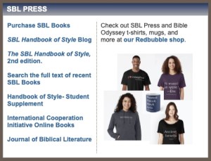 Although I’d heard of it uncomprehendingly when I was in seminary, I first joined the Society of Biblical Literature in 1991, while a doctoral student.  I religiously *ahem* attended the annual meetings until I lost my job and my ability to afford it.  When I landed in publishing I started attending again, and over all these years I’ve started to notice a lot of swag creeping in.  Publishers sell bauble headed theologians (aren’t they all?), playful knick-knacks, and even socks bearing the cover design of established commentary series.  It’s as if we want to tell the world that studying the Bible is cool.  (Why not purchase some nice warm socks?)  So I wasn’t really surprised when the society itself, fondly known as SBL, started selling its own merch.